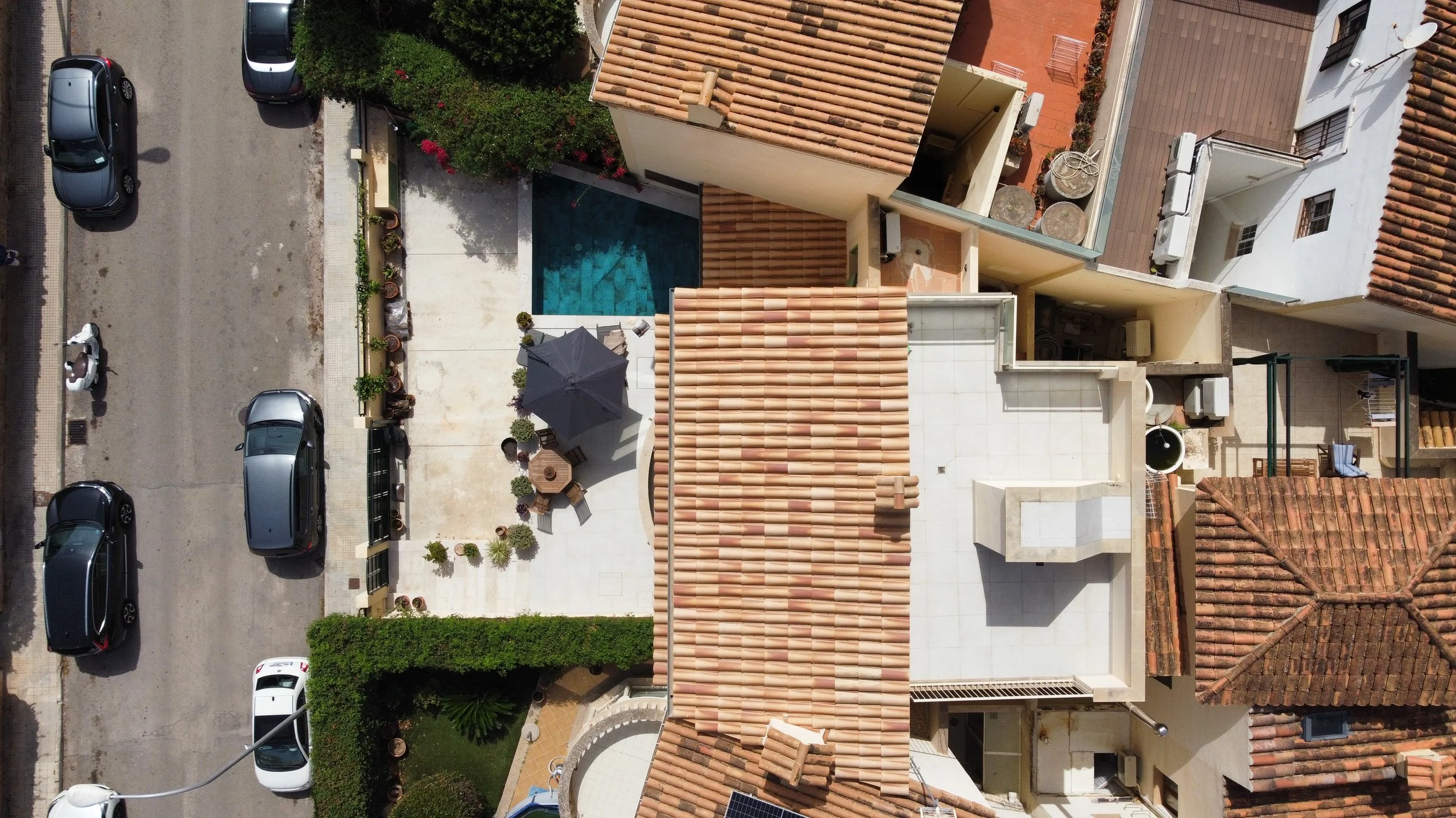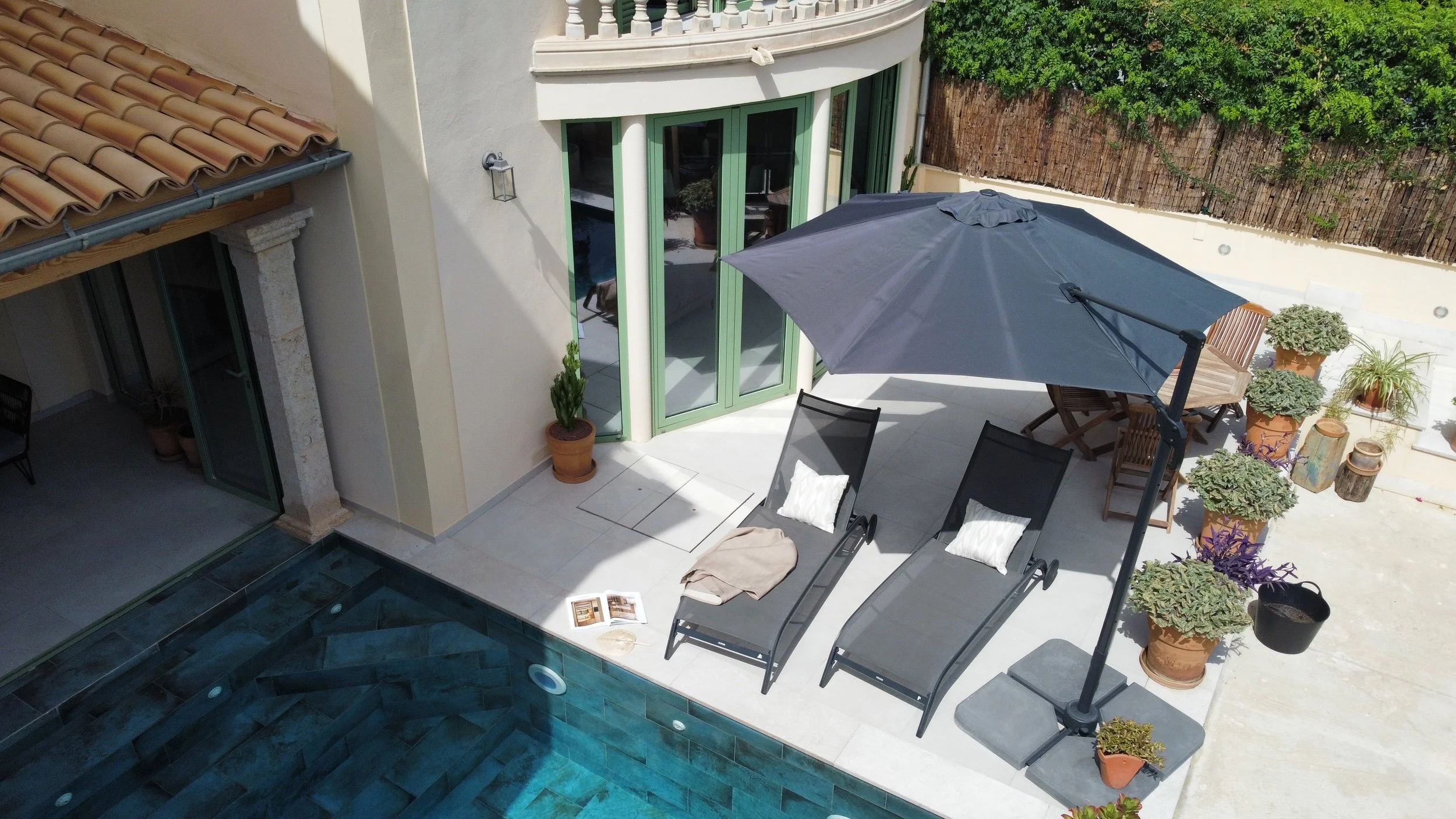 The third floor is very special with high ceilings, wooden beams and a spacious gym also used as a bedroom where you can sleep at least two people and comes with tailored made desk units. There is also a bathroom here and another room functioning as a TV room. From the third floor, you reach the roof terrace with stunning sea views big enough for a lounge group and a smaller dining table. Extra amenities are city gaz, bran new double glazed windows, AC in all rooms, filtered drinking water and totally renovated in 2020.